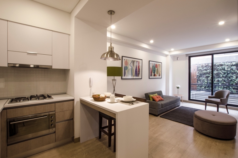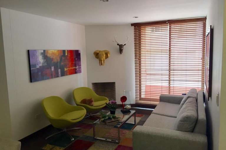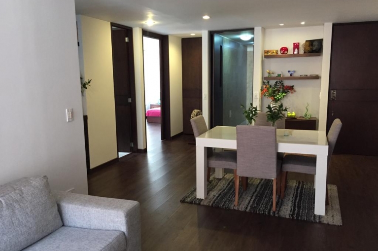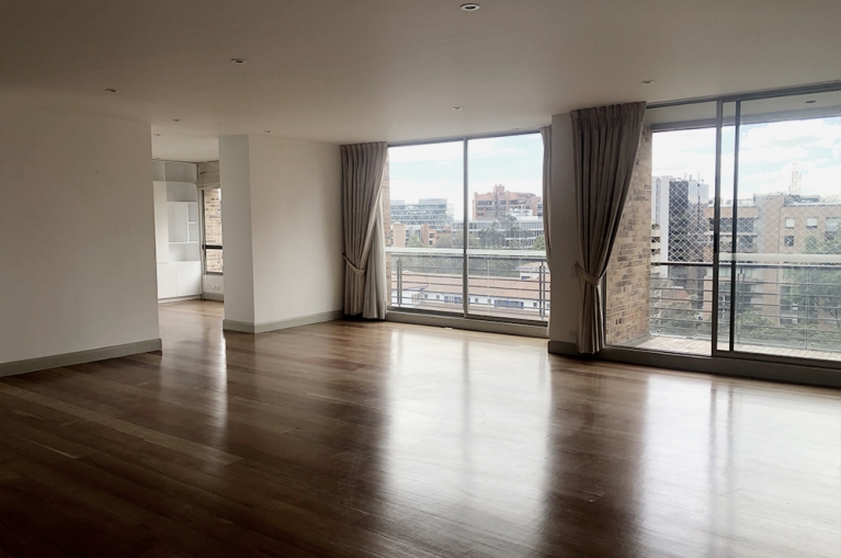 Apartamento de 97 mts + Balcón de área pequeña, 2 alcobas cada una con baño, baño social, sala comedor en el mismo ambiente, cocina cerrada, baño de servicio, zona de ropas independiente, 2 garajes independientes.